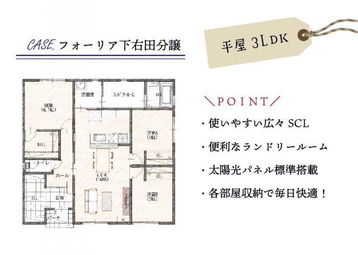 備考 | 太陽光発電6.6kWと蓄電池7.7kWを標準搭載したZEH仕様の新築平屋3LDK。高気密・高断熱で光熱費を抑えつつ、一年中快適な暮らしを実現。収納豊富な間取りと便利なランドリールーム、自然と家族が集まる16帖のLDKが魅力の住まいです。 |