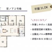 | その他設備情報 | 省エネルギー対策 / フラット35Sに対応 / 太陽光発電システム / 高気密高断熱住宅 / 地盤調査済 / 駐車3台以上可 / LDK18畳以上 / 山が見える / 陽当り良好 / 全居室収納 / 庭 / シャワー付洗面化粧台 / 複層ガラス / 床下収納 / TVモニタ付インターホン / 通風良 | 建物構造 | 木造1階建(軸組工法) |