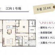 | 備考 | 太陽光発電システムを標準搭載した平屋3LDK。広々16帖のLDKとパントリー付きで家事もスムーズ。シューズインクロークや各部屋収納など、片付けやすさに配慮した住まいです。市街地に近く利便性も良好。 | ||