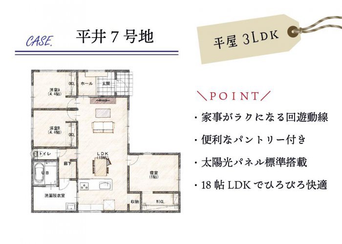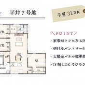 | 備考 | 太陽光発電6.6kWを搭載したG2仕様の平屋住宅。光熱費を抑えながら、夏は涼しく冬は暖かい快適な住環境を実現します。3LDKのコンパクトな間取りは家事動線が短く、子育て中のご家庭にも使いやすい設計。収納もしっかり確保されています。 | ||
