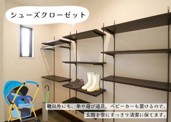 玄関まわりをすっきり保ち、ベビーカーやアウトドア用品の収納にも便利。 -