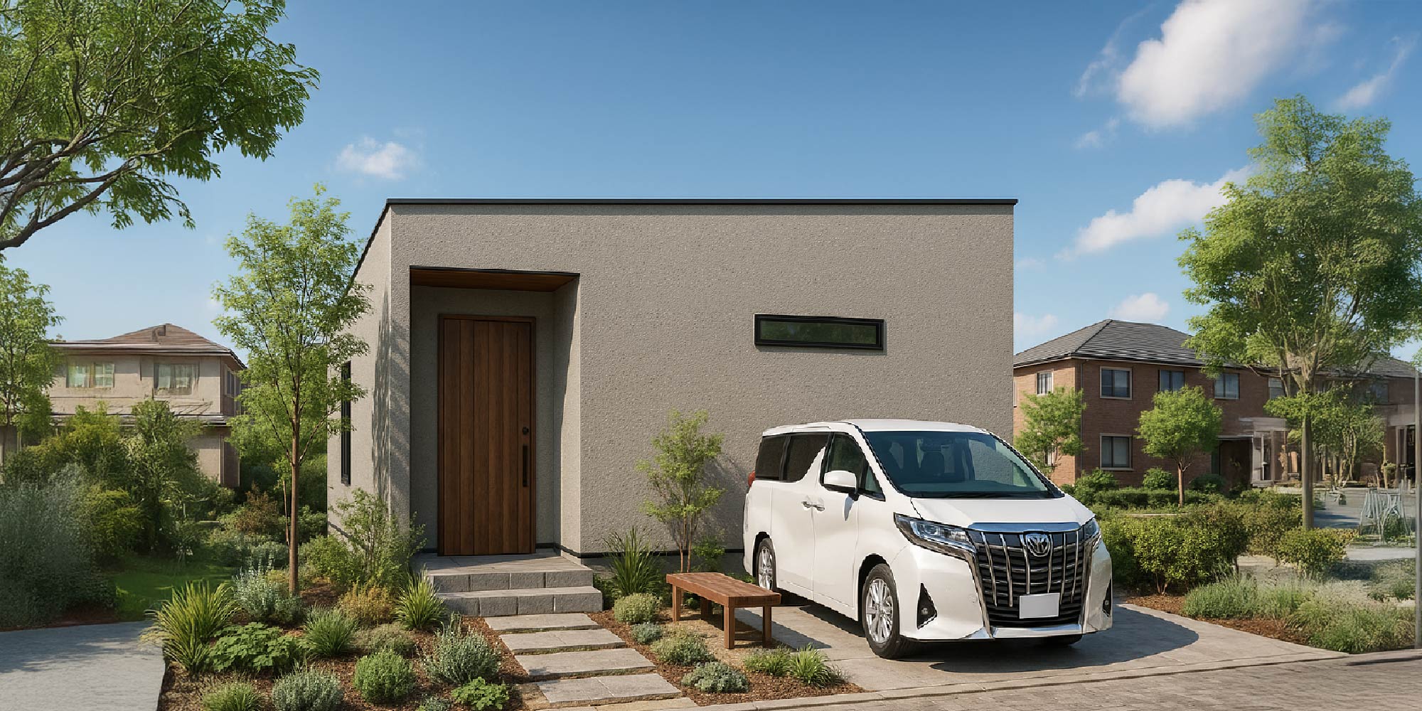 グレーを基調とした外観に木目の玄関ドアが映えるデザイン。角地の整形地に建ち、ゆとりある駐車スペースも確保。シンプルながら洗練された印象の外構で、来客時も安心の佇まいです。