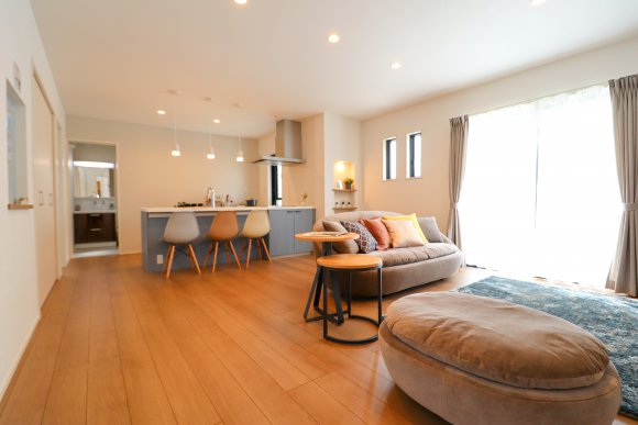 こちらのモデルハウスは、広々としたLDK の空間がとれるフルフラットの対面キッチン、小物が飾れるライト付きのニッチ、お掃除楽々なタンクレストイレ、ゆったり広めの浴室、アクセントクロスなど、今まで建てられたお客様の中で人気なオプションを取り入れました。